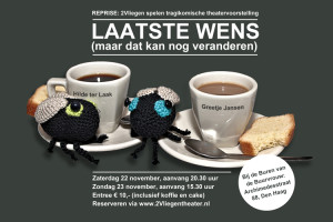 In LAATSTE WENS (MAAR DAT KAN NOG VERANDEREN) (2013-2014) gingen 2Vliegen op zoek naar wat hen gemaakt heeft tot wat ze waren, en naar wie ze zouden willen zijn. Ze vlogen al lachend, treurend, verzuchtend, hopend en verlangend door verleden, heden, toekomst, toeval, treurnis, tevredenheid, lot, geluk, irritatie, berusting, ambitie, intensiteit en passie. In heden, verleden en toekomst. Al dan niet reëel.